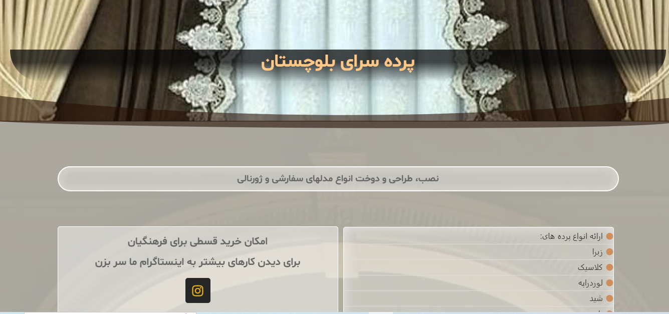 پرده سرای بلوچستان نصب، طراحی و دوخت انواع مدلهای سفارشی و ژورنالی ارائه انواع پرده های: زبرا کلاسیک لوردراپه شید پانچ پلیسه امکان خرید قسطی برای فرهنگیان برای دیدن کارهای بیشتر به اینستاگرام ما سر بزن Instagram گالری تصاویر قبلی بعدی شماره تماس ۰۹۳۸۹۸۵۷۷۴۱ آدرس ما سیستان و بلوچستان، ایرانشهر، پرده سرای بلوچستان Whatsapp Sms Mobile-alt
